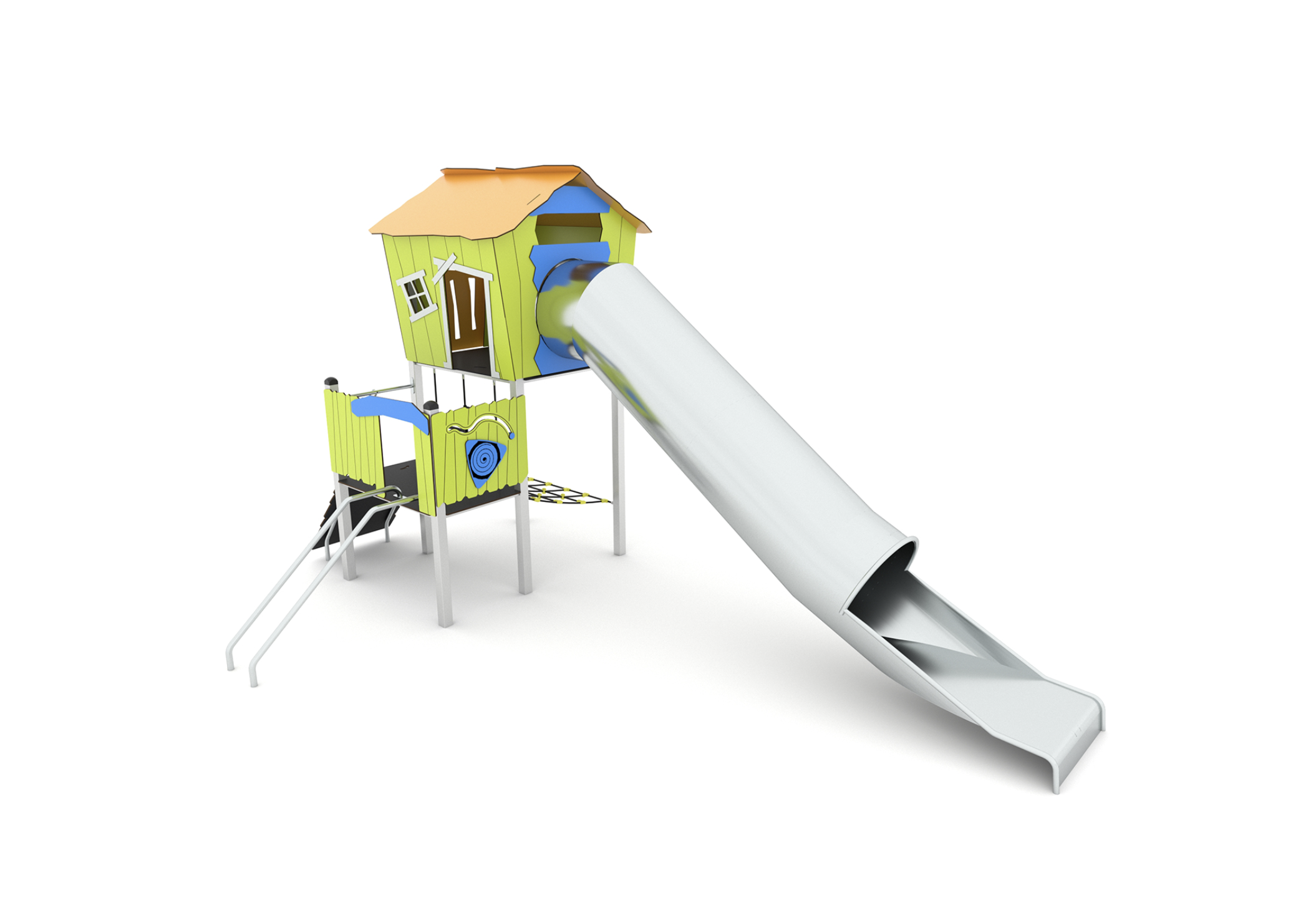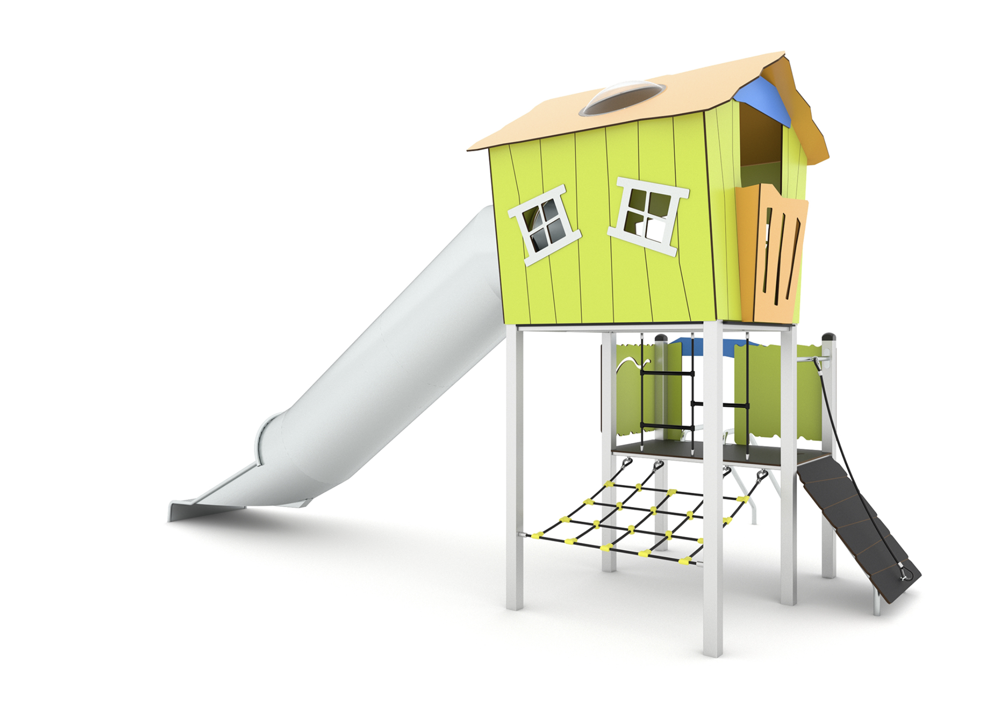 Structure combinée maisonnette toboggan tunnel hauteur 180 cm pour les moyen d’âge primaire.