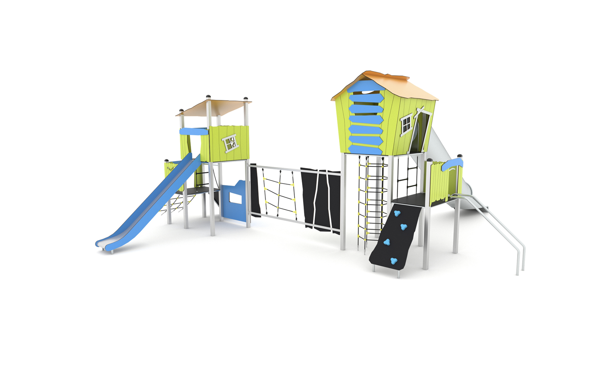 Grande structure Crooc avec 2 modèles de cabane et 2 toboggans différents.