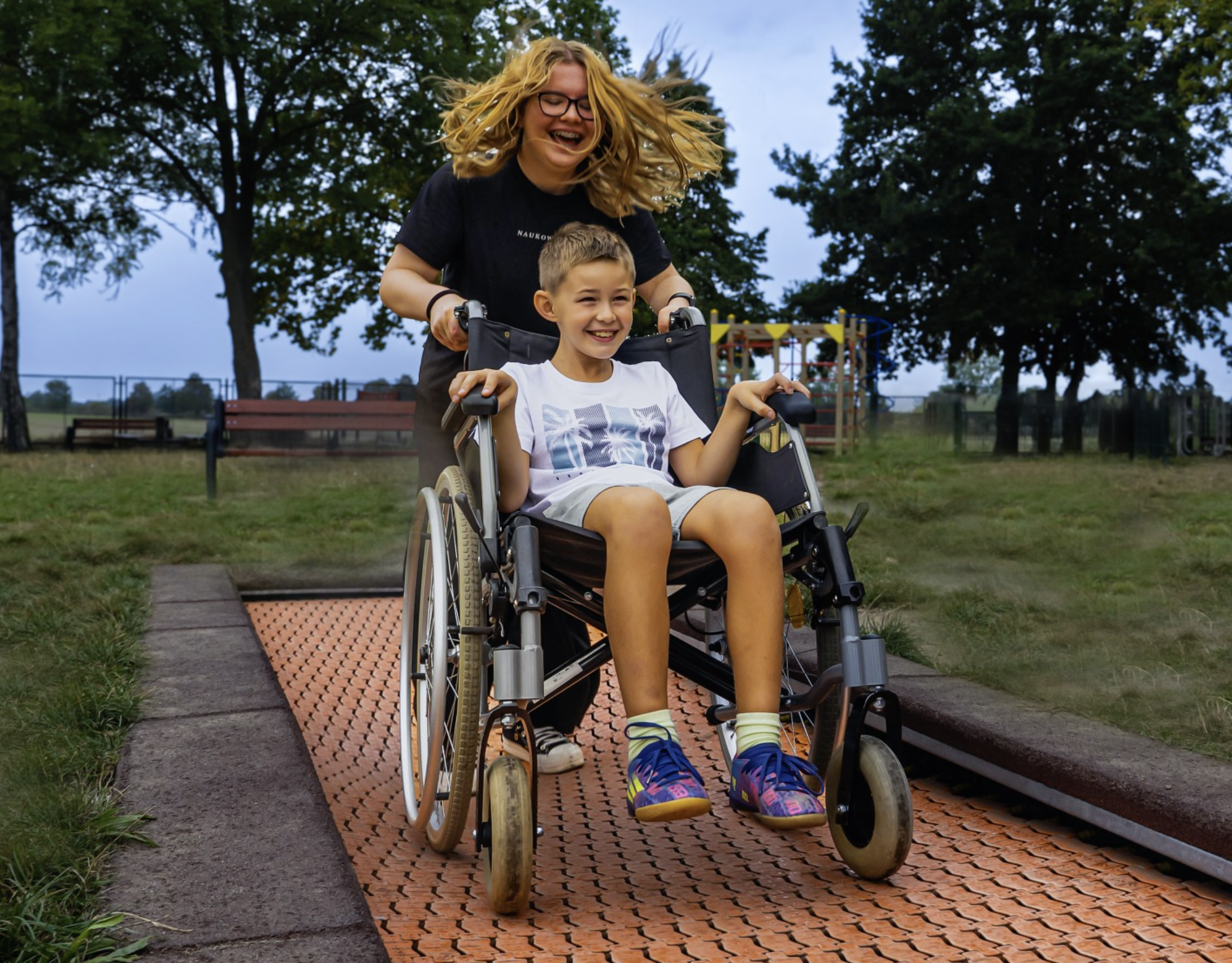 Trampoline Orta PMR dimension 150 x 250 cm, jeu très inclusif permettant avec ses 2 côtés chanfreinés la pose sur une allée autorisant les fauteuils, option coffre avec ouverture incluse.